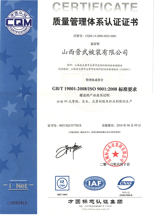 晉武被裝自1999年先后通過了ISO9001、ISO14001和OHS18001認證,并在2009年被獲得了“中國優質產品”證書,同時先后從日本、德國、美國引進先進的生產設備和先進的生產工藝,在2011年年初,我公司被評為“質量、服務、信譽AAA級金牌單位”。